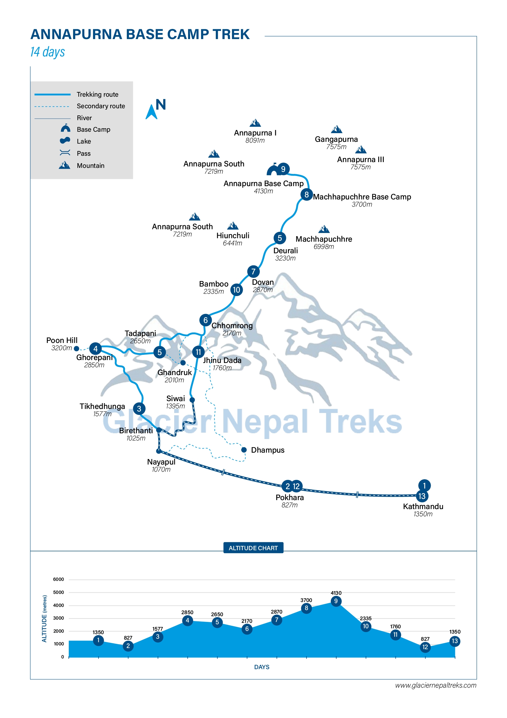 Dovan to Machapuchhre Base Camp (3700m) – 6 Hours It’s relatively short trek today. Our day begins early in the morning with the climb through bamboo forests first, and then through the forest of rhododendron on to Hinku Cave. We passing Deurali and bagar to climbing up to Machapuchhre Base Camp and stay overnight at a guesthouse.