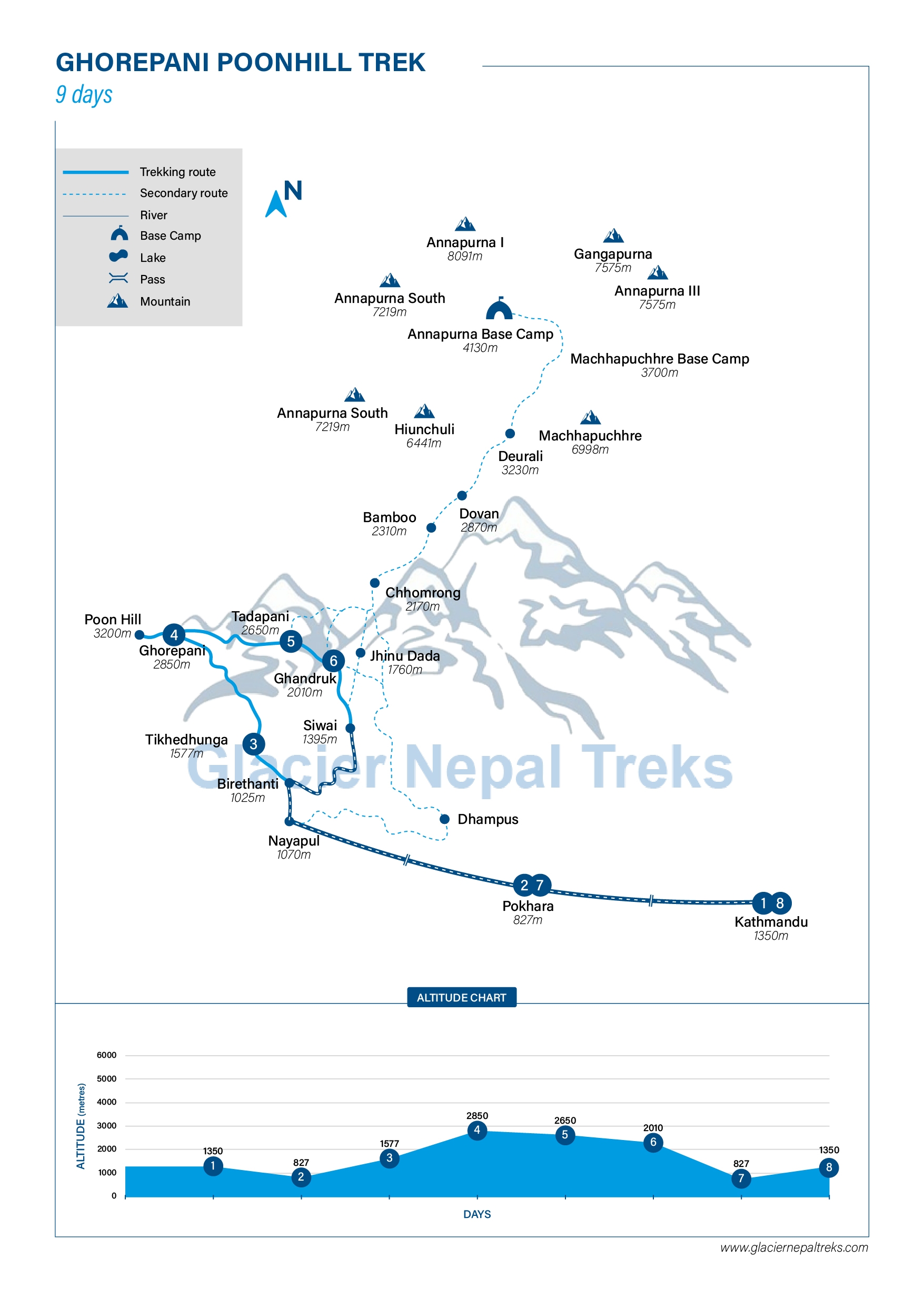 Tikhedhunga to Ghorepani Trek (2850m) – 6 Hours From Tikhedhunga, we move on towards the steep climb to Ulleri (2010m). Ulleri is a large Magar village. Our trail ascends more gently from this point through fine forests of oak and rhododendrons towards Banthanti (2250m). After walking for a couple of hours, we arrive at Ghorepani (2840m) where we stay overnight.